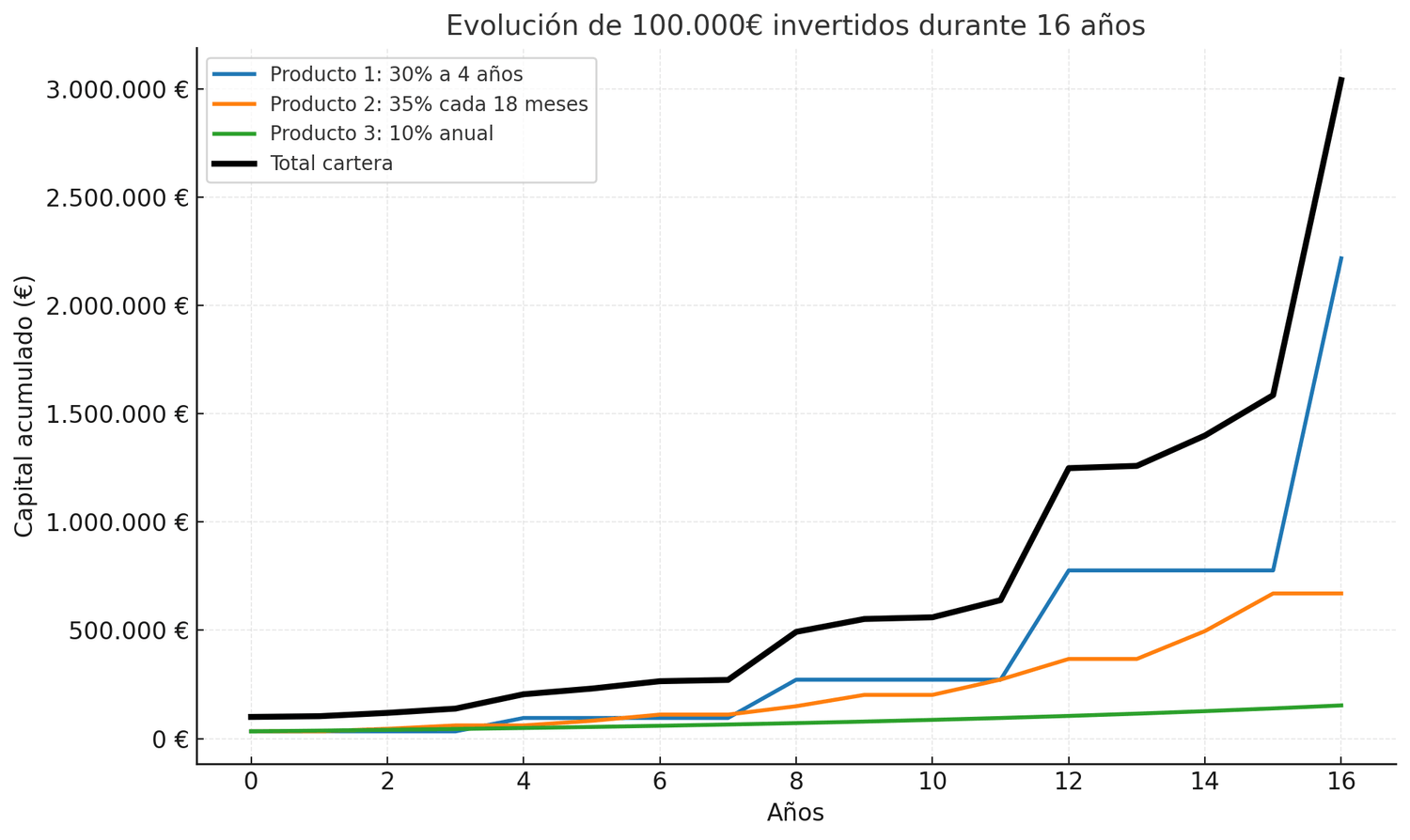 Este gráfico muestra cómo evoluciona una inversión inicial de 100.000 €, repartida en partes iguales entre tres productos, durante un horizonte de 16 años: